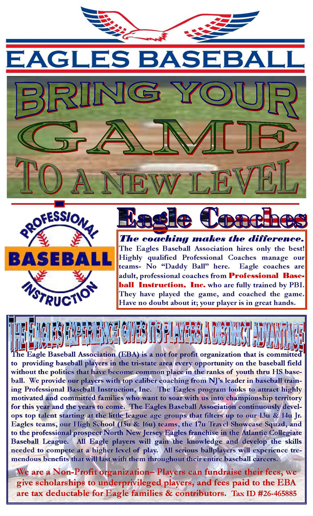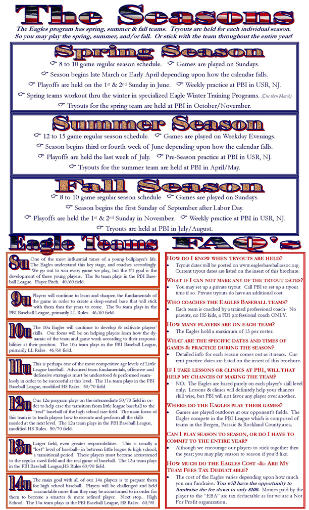 ![]() EAGLES BASEBALL ASSOCIATION WEBSITE SPRING EAGLES TEAM TRYOUTS ANNOUNCED ![]() Fall may have just begun, but we're already looking forward to spring 2013 for Eagles baseball! Tryouts for all our teams between the ages of 8 and 14 will be held at PBI's indoor training facility in Upper Saddle River